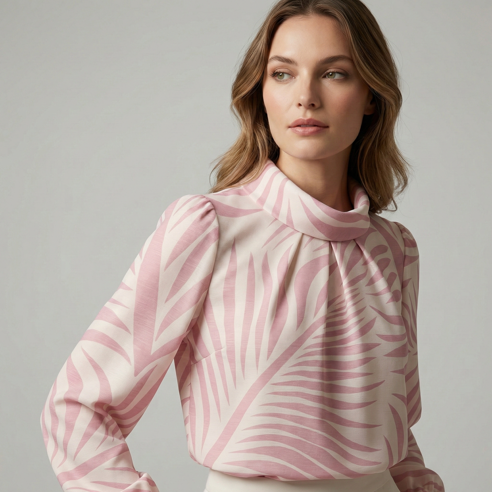 Nuestra blusa elegante estampado botánico en tonos rosa y crema ha sido diseñada para la mujer que busca un equilibrio entre la sofisticación clásica y las tendencias actuales. Confeccionada en un tejido fluido de poliéster que no se arruga, esta prenda destaca por su cuello alto con detalle drapeado, aportando luminosidad y estilo a cualquier conjunto profesional o de evento.
